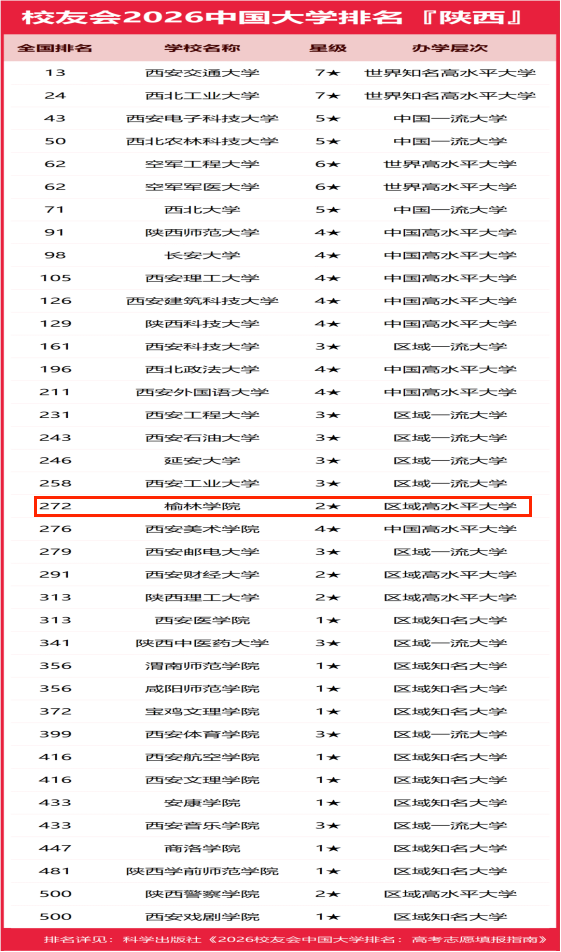 近日,全国第三方大学评价机构艾瑞深校友会网(Cuaa.net)发布校友会2026中国大学排名(陕西)榜单,榆林学院表现亮眼,位列全国第272位,较上一年度排名实现显著跃升,前进19位。这一成绩充分彰显了学校近年来在人才培养、学科建设、社会服务及综合办学实力等方面的持续进步与积极成效。