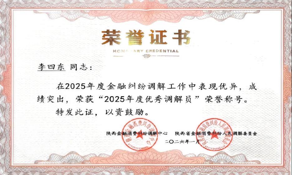 喜报|我校2010届法学专业校友李四东获评陕西金融消费纠纷调解中心“优秀调解员”